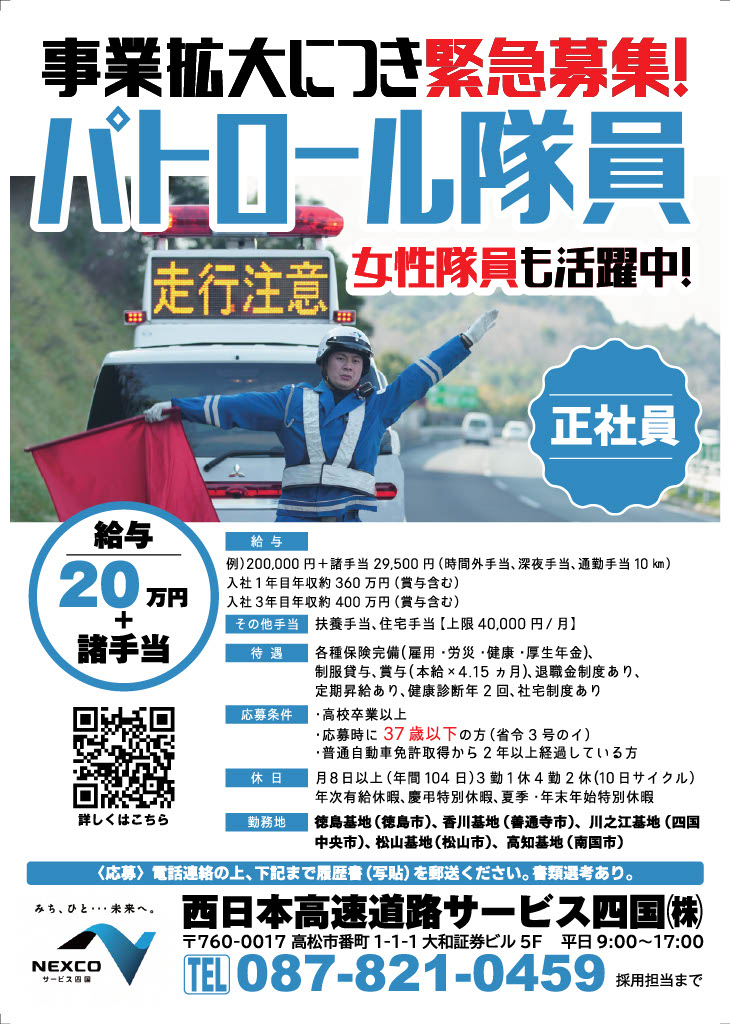 定期的に道路巡回を行ない、お客様の安全・安心のため、道路状況の把握や落下物の回収、事故処理などをおこなっています。